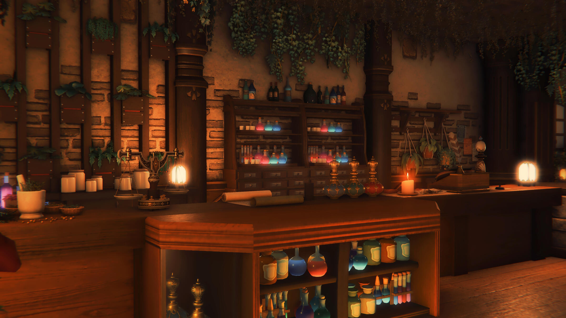 An off-beaten path leads to this secluded lodge within the heavily congested forests within the southern side of the Black Shroud, a warm and welcoming aura protrudes to all travelers and adventurers with a safe, comforting embrace. Etched carvings on the sign that leads into the entrance simply reading, 'Fontaine's Apothecary - Medicine & Health'. Despite being quite a few malms away from the next nearby settlement, the occupied land within seems quite carefully tended to.